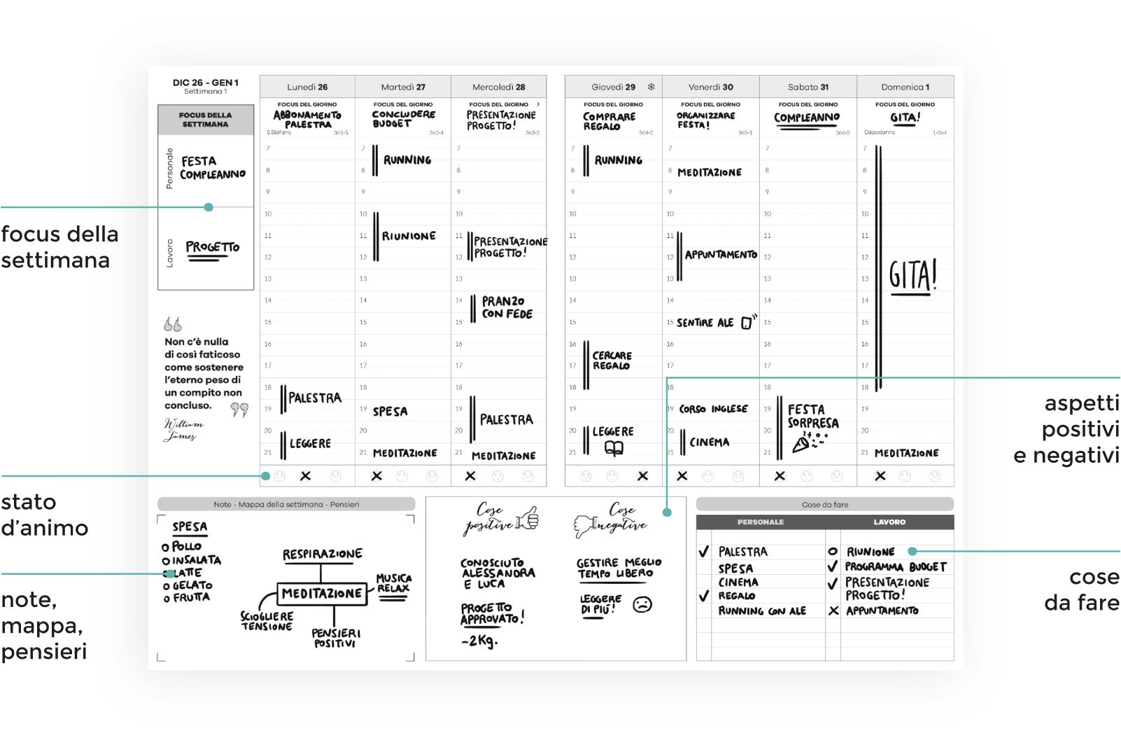 Come il nome lascia intuire, l’agenda è pensata per organizzare gli appuntamenti, le fatiche, i doveri, i risultati e i pensieri quotidiani (sia personali che professionali). Il layout è ordinato e libero di essere interpretato a piacimento: fondamentalmente c’è tutto quello che mi serve, dagli spazi per separare gli impegni giornalieri da quelli settimanali, e anche qualche piccolo box per appunti extra che mi aiutano a non perdere le redini della mia vita. A volte capita.