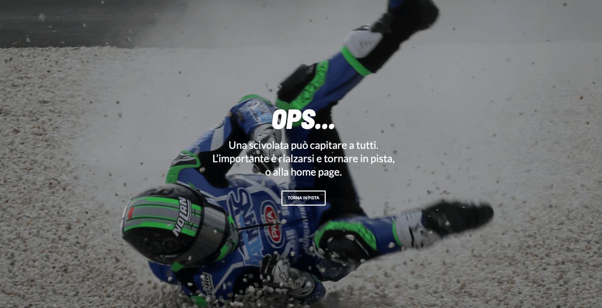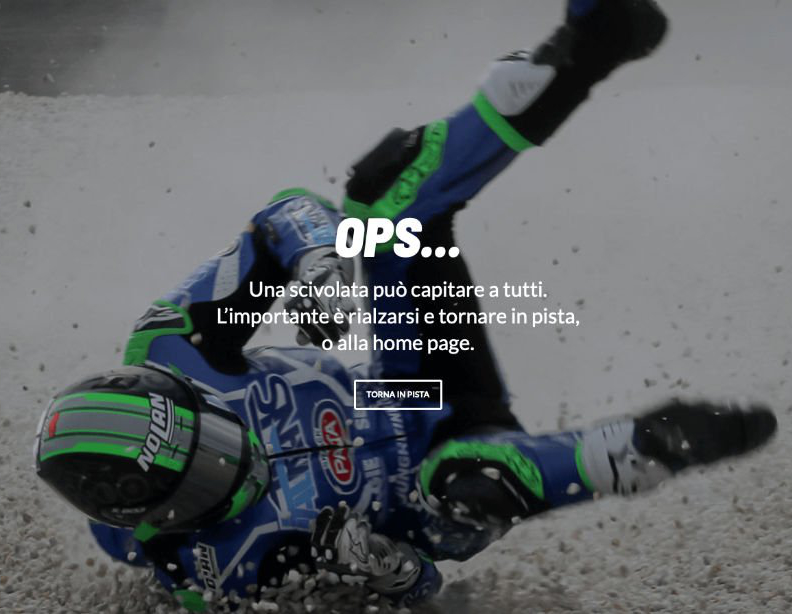Ho recentemente collaborato alla progettazione del sito web di Enea Bastianini, pilota di Moto2. Per la scrittura della pagina 404 ho pensato al concetto di errore: quale può essere l’errore che può capitare a uno che corre in moto? Cadere, ovviamente. Ho dunque cercato la foto di una scivolata, di quelle non belle da mettere in prima pagina ma che, a pensarci bene, in una pagina nascosta trovano il loro habitat perfetto.