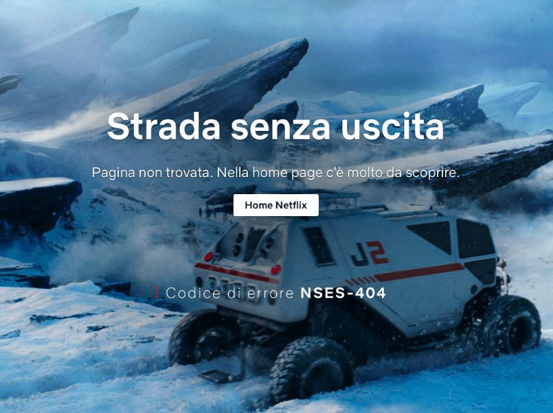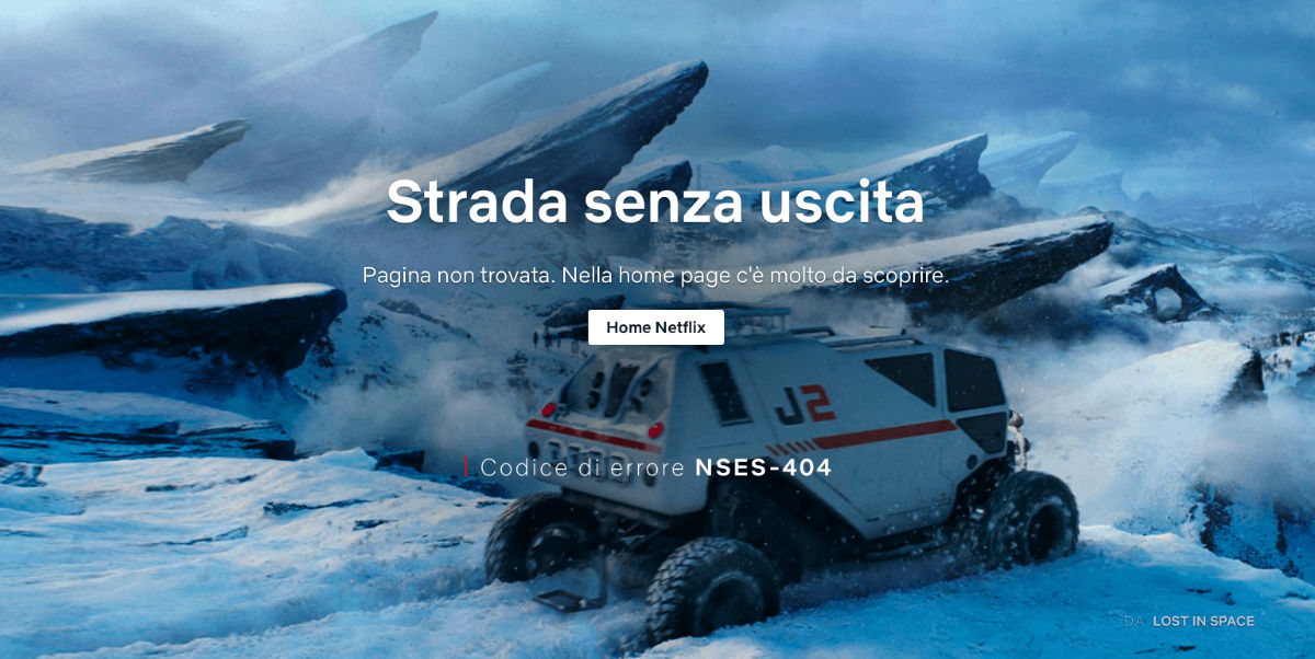 Se invece di un luogo trovi significativo sfruttare un prodotto o un servizio puoi fare come Netflix, che nella sua 404 oggi mostra un’immagine tratta dalla serie Lost In Space con un titolo tuonante: Strada senza uscita. La scelta di una serie come Lost In Space, ovviamente, non è casuale.
