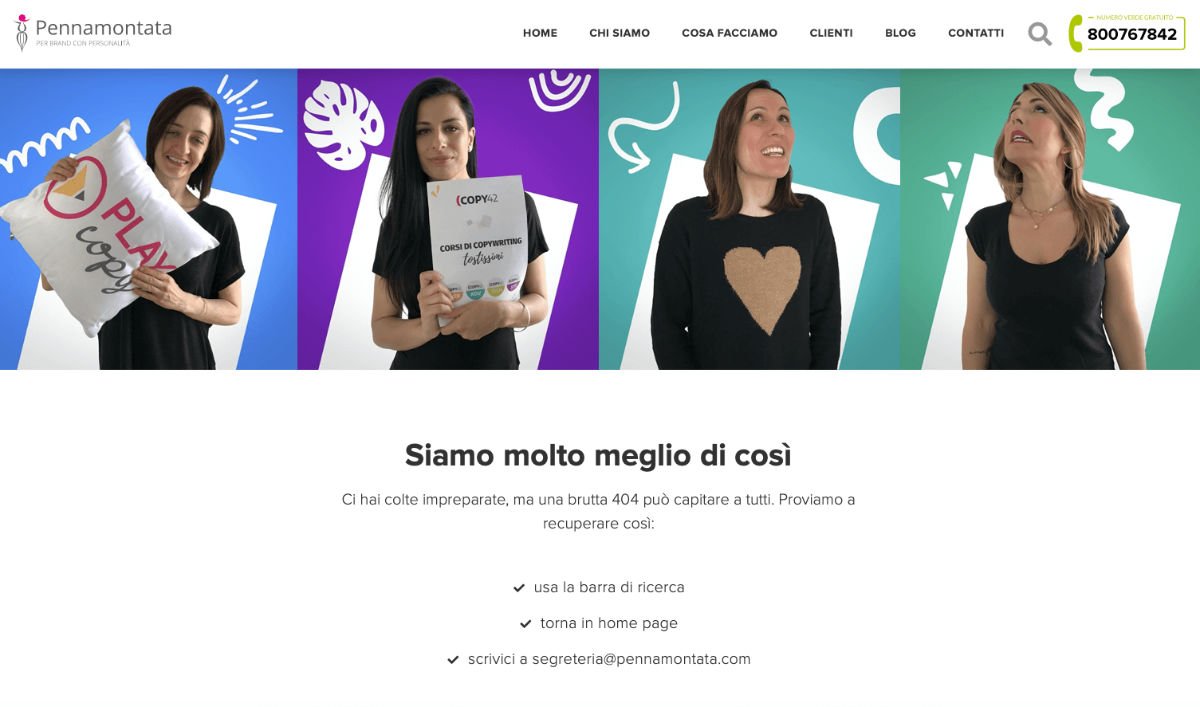 Quelli appena citati sono esempi, non regole. In una pagina di errore 404 possiamo davvero dare sfogo alla nostra creatività. Penso a quella di Pennamontata, dove le ragazze dell’agenzia appaiono impreparate e senza quel sorrisone smagliante che le contraddistingue. Poi il testo, sotto, rassicura tutti: