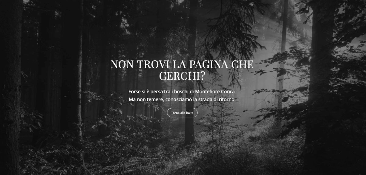 Un altro esempio: c’è qualcosa che caratterizza davvero l’azienda? Un disegno, un prodotto, una mascotte, un luogo, una persona. Qualsiasi cosa. Ecco, è il caso di questa baita nascosta tra i boschi di Montefiore Conca, nell’entroterra romagnolo. L’agenzia con cui collaboro ne ha progettato il sito web e per l’occasione mi sono occupato della pagina 404, solo quella.