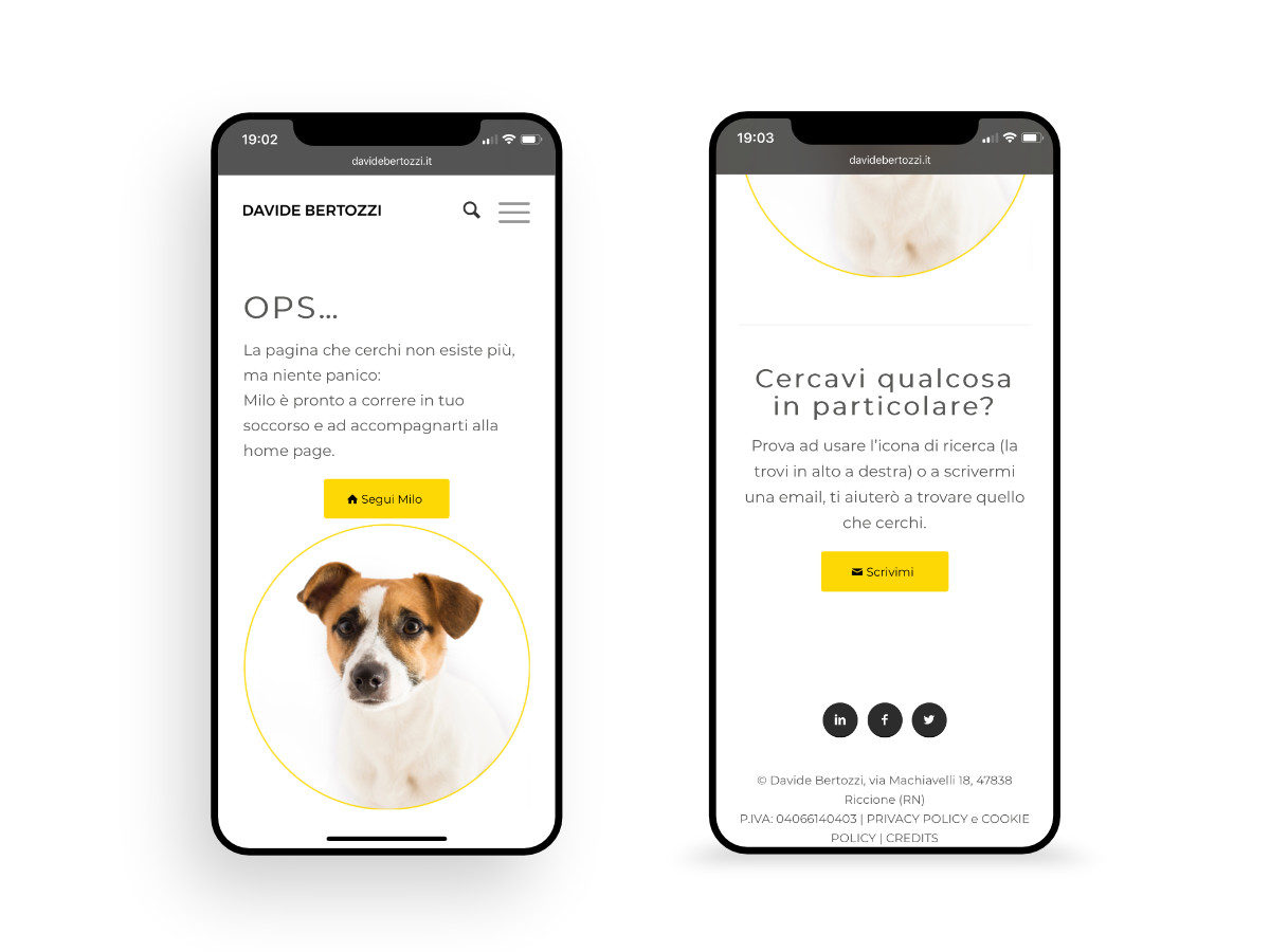 Comunque: concentriamoci sulla mia pagina di errore 404. Ok Milo, va bene, la sua foto serve solo per rendere il tutto un po’ più dolce. In fondo, se capiti involontariamente nella mia 404 in realtà cercavi qualcos’altro, quindi in qualche modo devo chiederti scusa o tentare di strapparti un sorriso. E per riuscire in questo penso che il musino del mio cane sia perfetto. Non trovi?