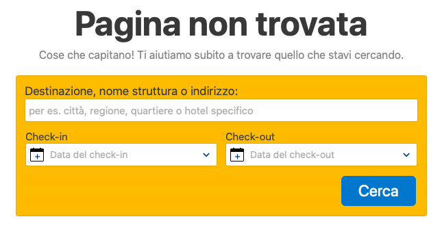 È interessante la pagina 404 di Booking, e qui io non c’entro, già, però la trovo davvero utile per i viaggiatori. Su Booking ci finisci perché cerchi un viaggio, pigi il dito in un pulsante, o clicchi in un banner, e qui capita facilmente di atterrare in una pagina scaduta; magari l’offerta è terminata e il webmaster s’è scordato di aggiornare i contenuti. O forse qualcun altro ha combinato un pasticcio con link e pulsanti. Insomma, son cose che capitano, e Booking è lì con il suo bel modulo da farti compilare per aiutarti a trovare l’hotel che cerchi. Mantenere il contatto con il pubblico, ricordi?